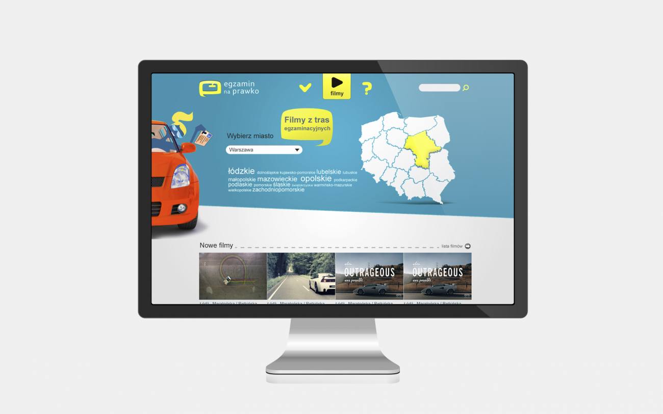 Propozycja logo zakładała połączenie kilku symboli i skojarzeń. Jazda samochodem, filmowy charakter serwisu i podkreślenie działania firmy w kategorii e-kursów. Opracowałem również koncepcję strony internetowej.